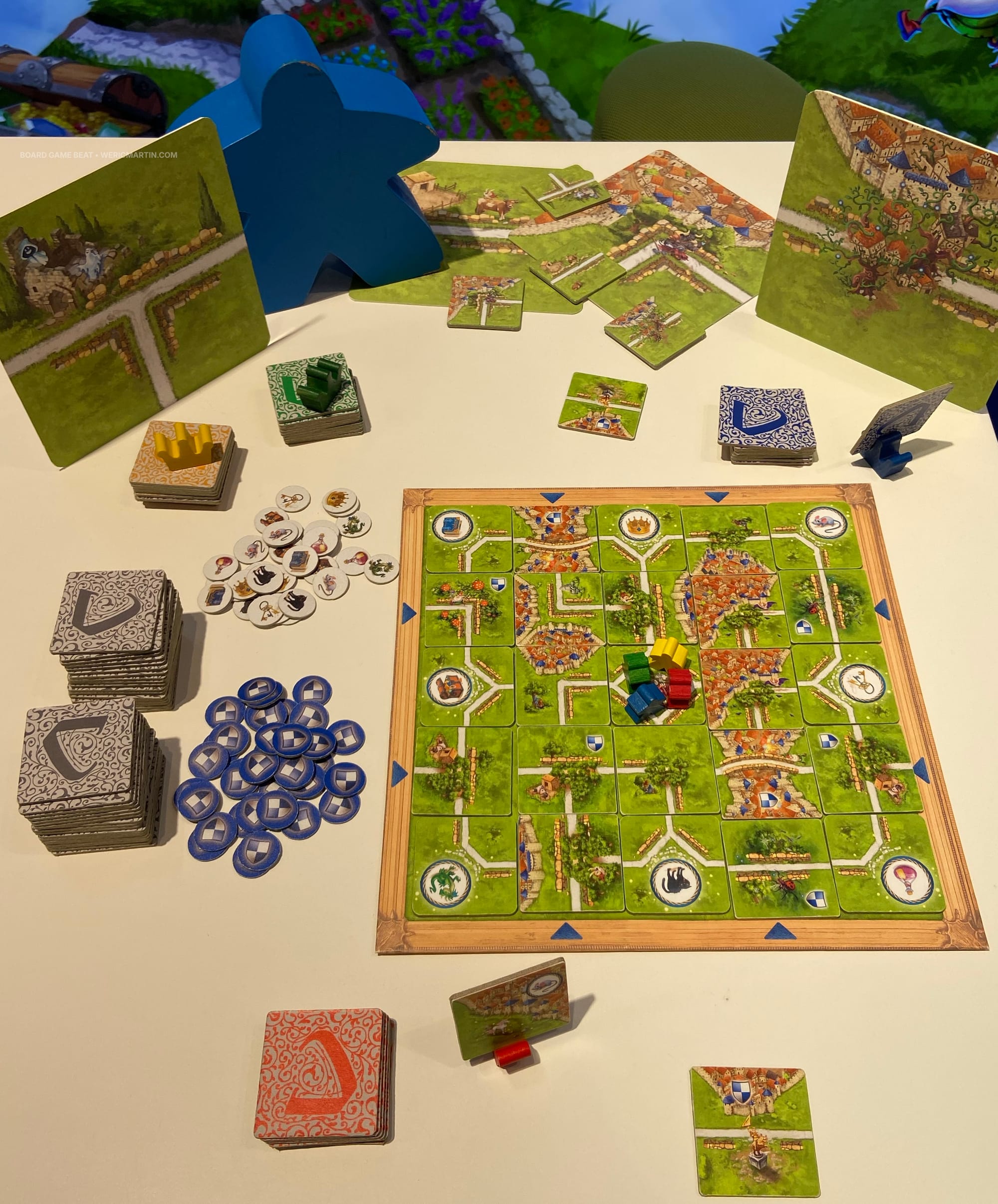 At SPIEL Essen 25, Ravensburger had announced that designers Max J. Kobbert and Klaus-Jürgen Wrede were working together on a game that would merge their two signature titles, respectively Labyrinth and Carcassonne. You can see the result — Carcassonne Labyrinth — in the images above and below, with this 2-4 player game scheduled for release in September 2026.