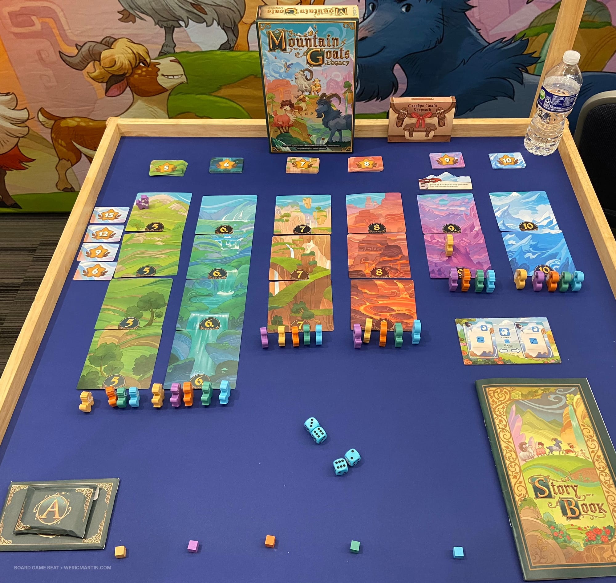 Another Gen Con 2026 release from Allplay is Mountain Goats: Legacy from Alex Cutler, Michael Mihealsick, and original Mountain Goats designer Stefan Risthaus. As in the original game, you want to use dice results to climb mountains with your goat and stand above everyone else, but the "legacy" version of the game adds a story mode that will introduce new elements in each game, as demonstrated in this spoiler-y image: