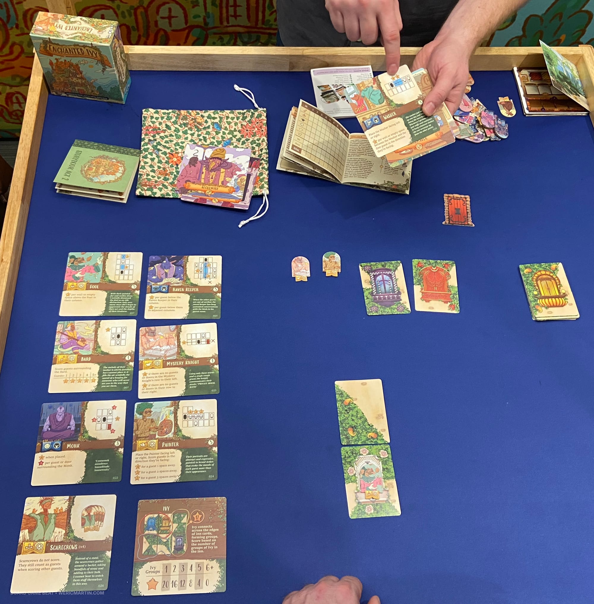 Sarah Joshua's Enchanted Ivy is a solitaire game that can be played as a one-off with random guests, which are seen at left in the image above, or in story mode with a particular group of guests. The guests matter because they have scoring conditions you want to maximize while constructing your magical inn over the course of play.