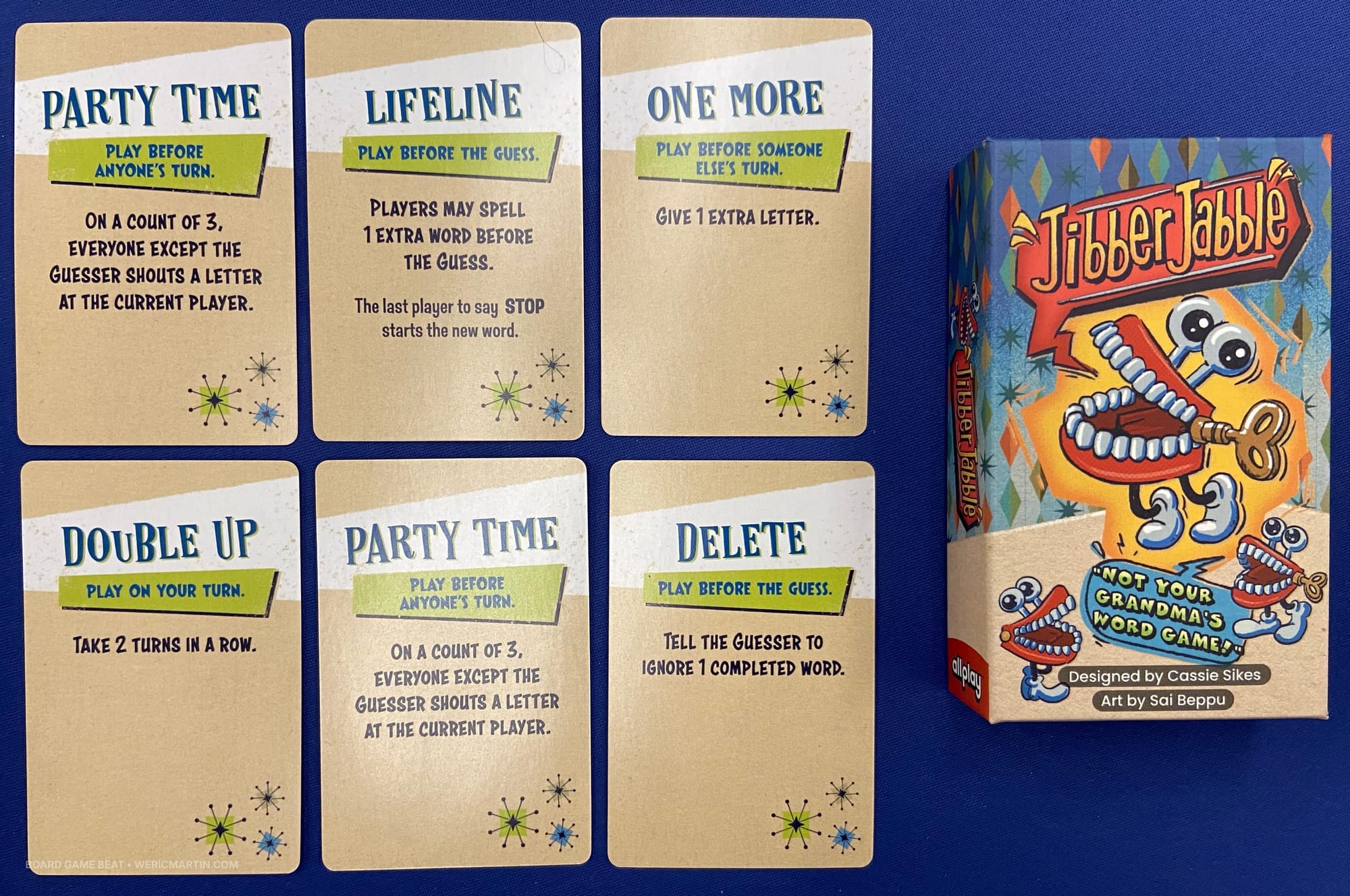 Jibber Jabble is listed as being for 3-30 players, and in practice it's one of those party games in which you could keep score, but will likely decline to do so. In a round, a player calls out 1-6 to identify a mystery word or phrase on a card that everyone else will see and try to get that player to guess.