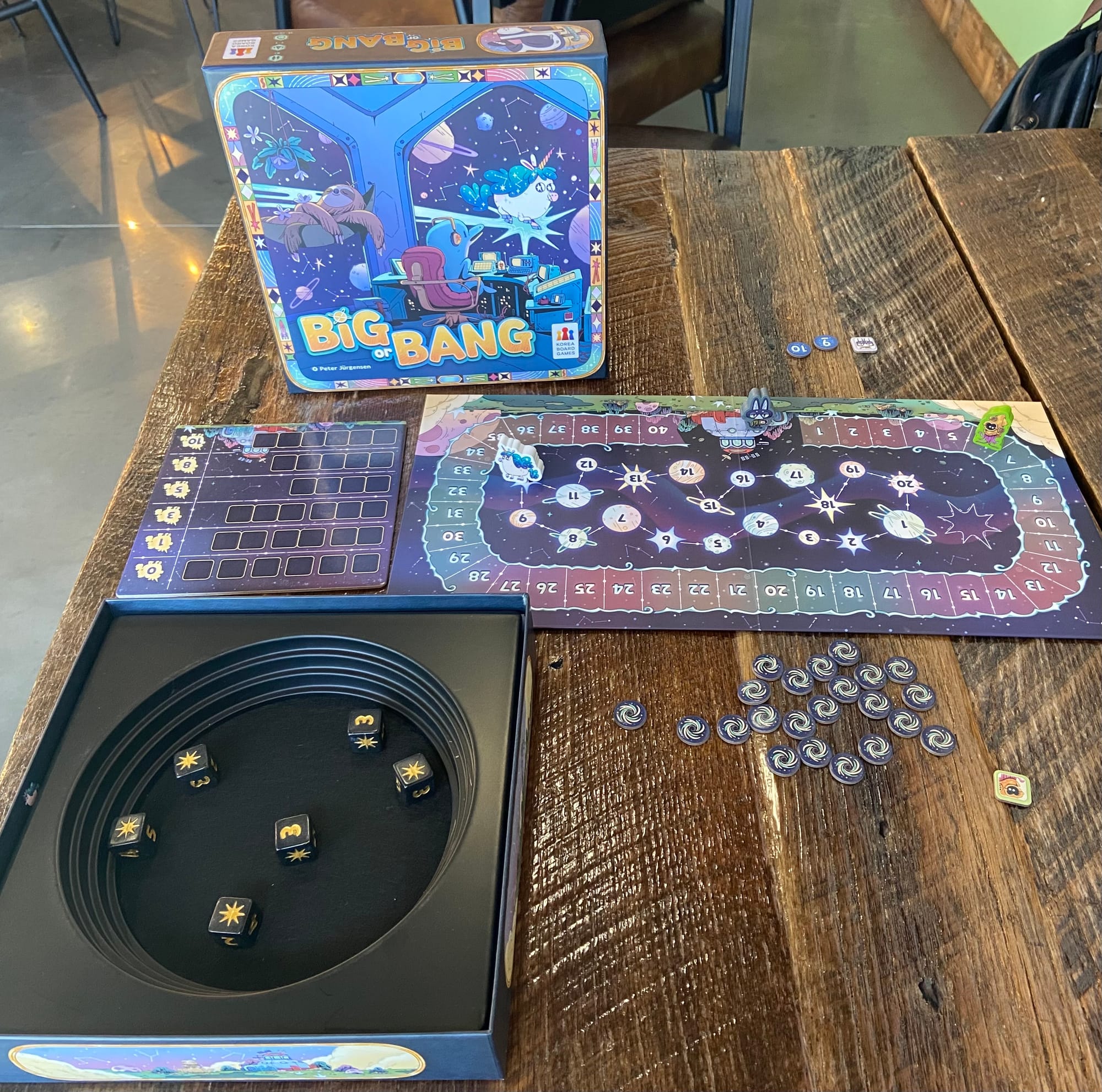 I'm having a similar experience with Peter Jürgensen's Big or Bang, which I've played four times on a review copy from Korea Boardgames. Gameplay is akin to Cosmic Wimpout and other games from that family: Roll dice, set some aside, then decide to stop and score, or roll again at the risk of busting. If you use all of the dice, you get to pick them all up and start again, adding to the points already banked.
