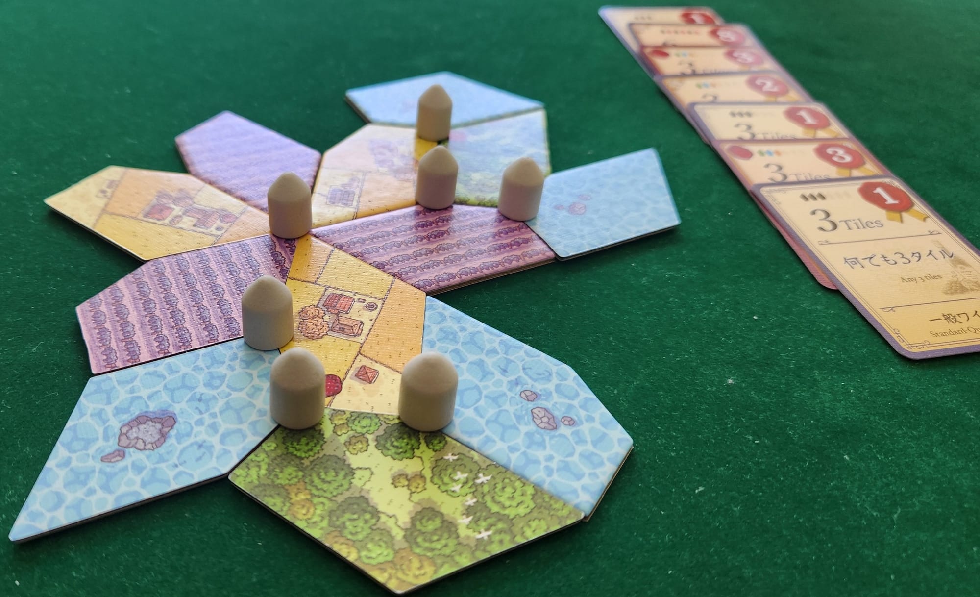 When you "complete a circle" by filling the gap where vertices meet, you mark that point with a wine cellar and take a wine card. The more tiles in a "circle", the more points you score, and if you use the right combination of tiles — as with the orange, blue, and green meeting in the bottom center of the image above, or the three orange in the six-vertex circle — you score an even more valuable high-quality wine card.