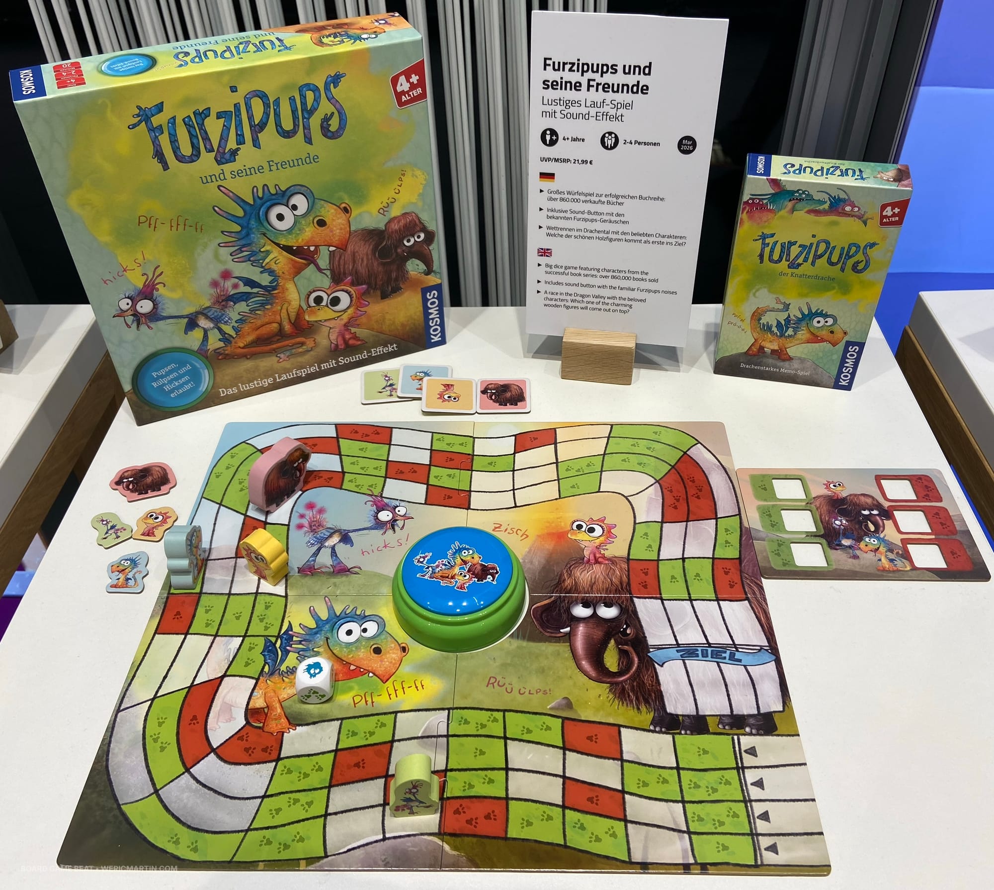 For 2026, KOSMOS has a new such adaptation: Furzipups und seine Freunde from Manfred Ludwig, with 2-4 players racing to reach the end of the track first, with movement controlled by a die roll and random fart sounds generated by the included device. Farts determine who gets to move next! Be sure to introduce this rule in your next game.