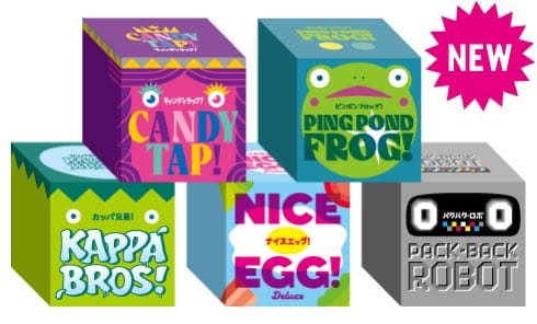 ▪️ Japanese publisher itten released the tiny cubic games Kappa Bros! and Nice Egg! in 2019, and at Game Market in May 2026 it's adding three more titles to the line: Ping Pond Frog!, Candy Tap!, and the surprisingly non-exclamatory Pack-Back Robot. So far only this single image has been revealed.