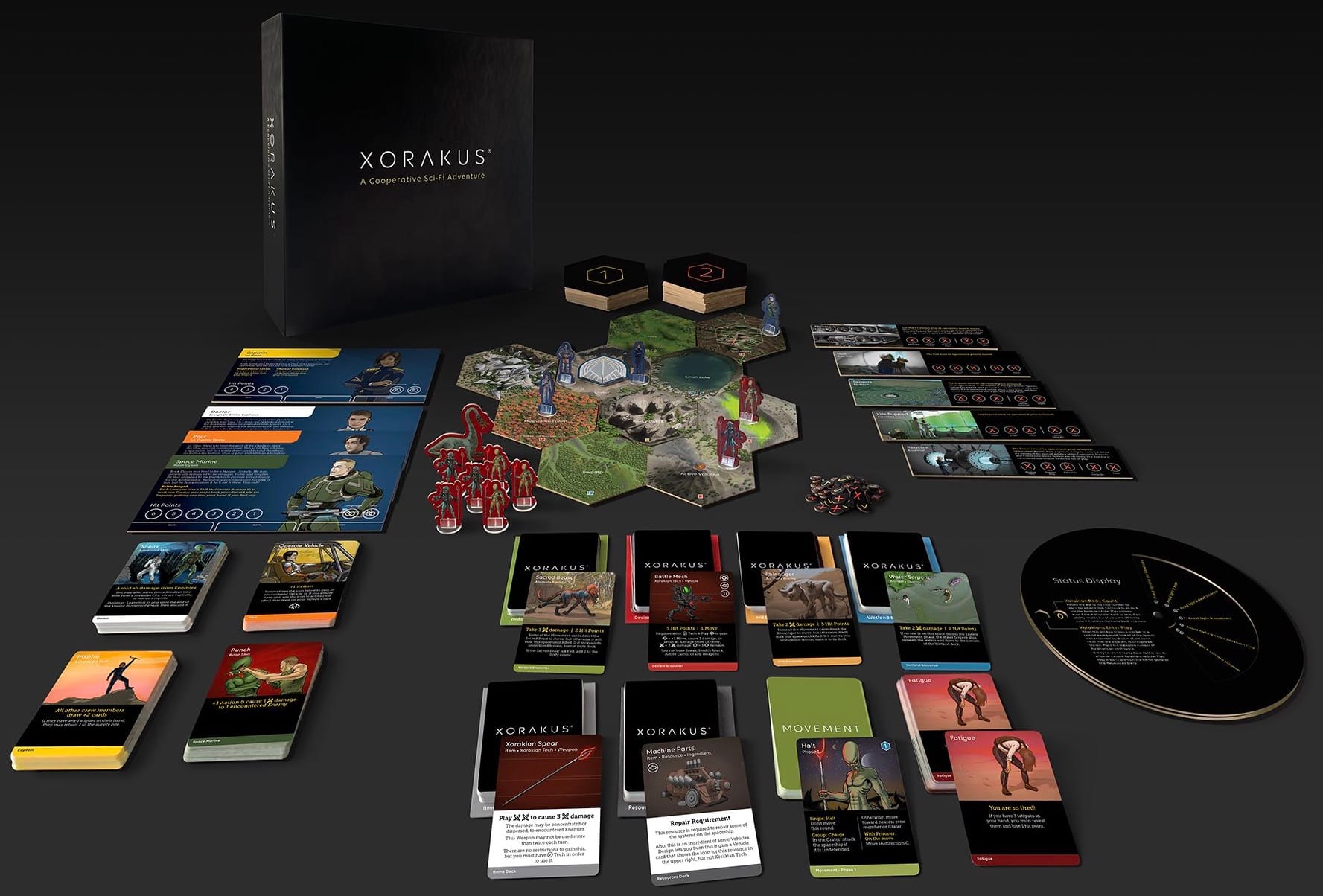 Like Shadow Brume, Xorakus has a familiar setting: You've crash landed on a planet, and now you must explore this world, find resources, repair your ship, and escape. Each player controls a character with unique powers (check!), and you can further customize your character thanks to your personal improvement deck; when you access this, you draw three cards at a time and choose one to add to your deck. If only college were this easy...