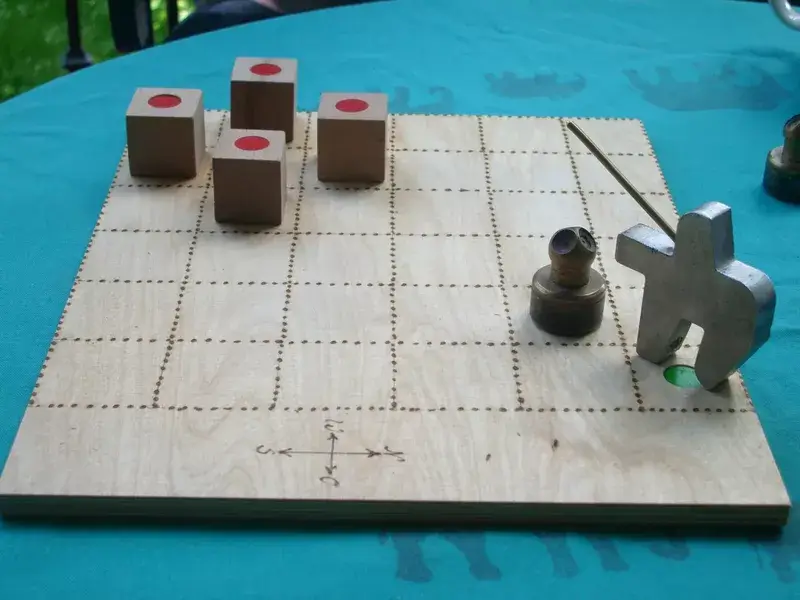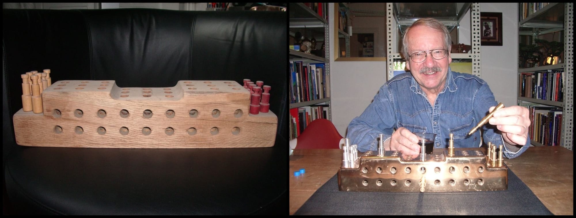 When I met Reinhold [in 2007], he was 70 and still full of ideas, but now largely moved to making games only by hand and in small series. This was related to another passion of his, namely "art from scrap". Almost every weekend he drove to a friend's junkyard and browsed for interesting objects, mostly made of metal. From these parts he built his puppets, his impressive animal sculptures, and occasionally also games. I remember him coming back from the junkyard in 2009 with 31 equal aluminum parts. Seemingly arbitrary parts — but Reinhold drilled them, put a metal lance in it, and had thus created the knight for Matthias Schmitt’s Don Q. und der Dreh mit den Windmühlen. The edition of the game was correspondingly 31 copies (today wanted collectibles). He built other games out of wood, used residual material from previous Perlhuhn games or created individual pieces, often for games already published elsewhere. I’ve seen him use car floor mats, irregularly shaped blocks of clay, roasting pans, scales, cattle troughs — and who knows what else.