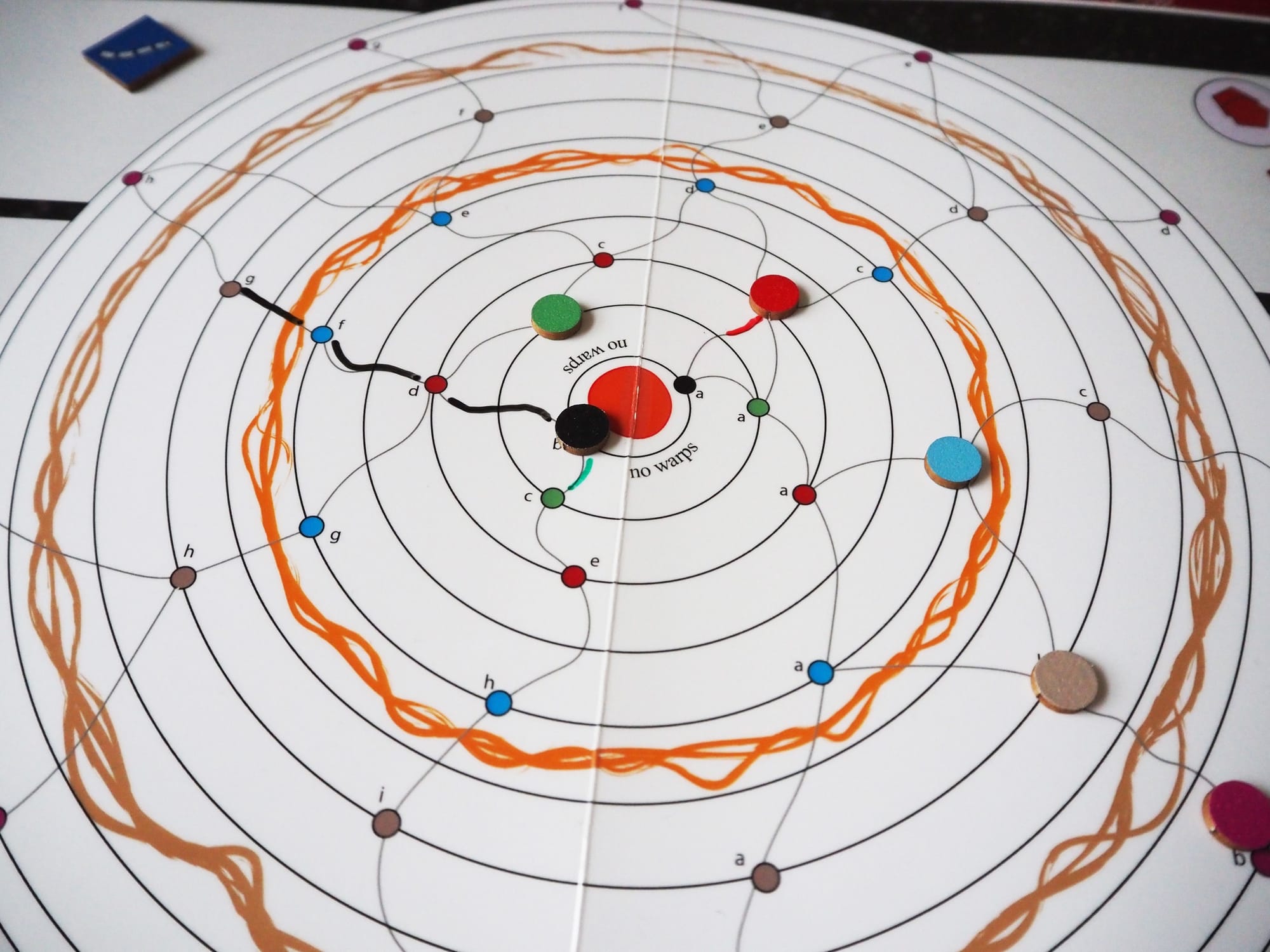 This happened in the early 2020s, but as she tried to instantiate this design, she kept having trouble making the planets cleanly orbit at different speeds. "There were some early prototypes where there wasn't a map at all", she says, "but free-floating planet counters that were moved according to rulers. Very fiddly stuff, and it would end up being quite expensive."