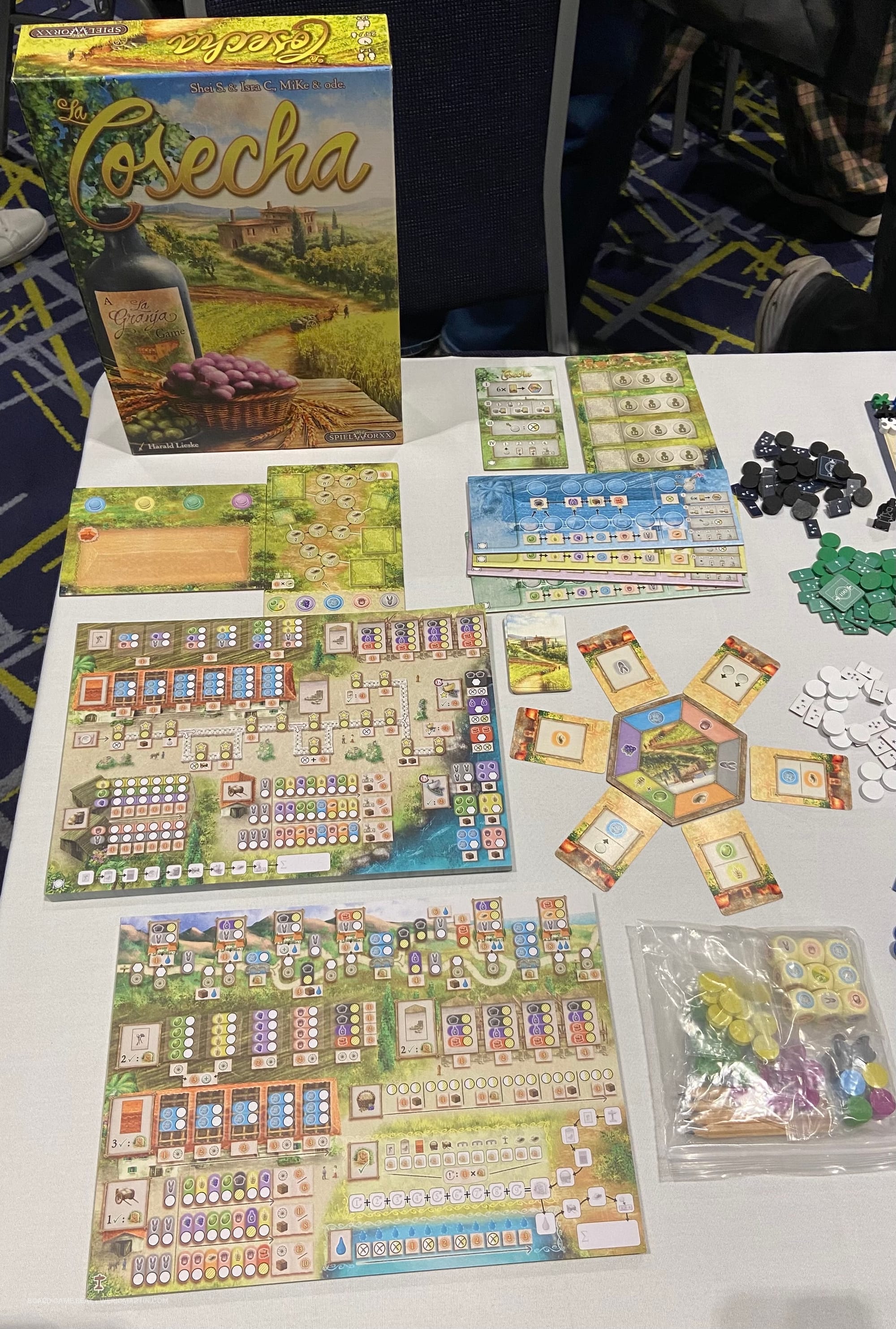 Farming is also at the heart of La Cosecha, a design from Isra C., Shei S., Michael Keller, and Andreas Odendahl that German publisher Spielworxx will debut in October 2026 and that Capstone Games will release in North America. La Cosecha is set in the world of La Granja, a Keller and Odendahl design that debuted in 2014, and the publisher offers this short description: