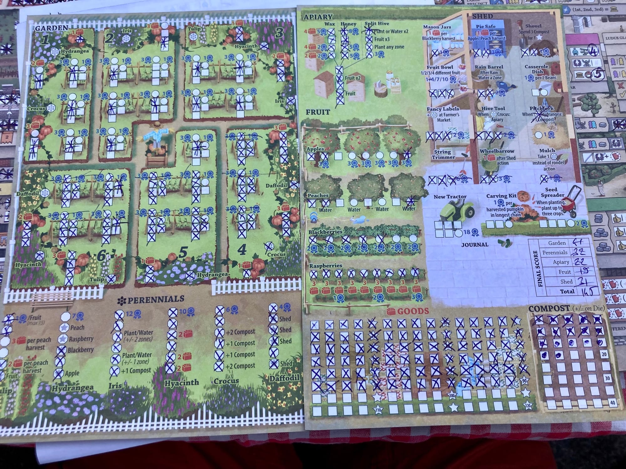 It’s harvest time on Mallorca, where you run your farm in the idyllic hamlet of Alpich near the town of Esporles. Each round, you harvest goods such as olives, grapes, and grain to mark boxes in different areas of your farm sheet. Fields need tending, the barn roof needs covering, and market carts want loading — your farm is full of opportunities, with the challenges differing on the two player sheets. In "La Fiesta", shown at top in the image above, you will host a banquet, and in "El Camino", you can travel the long road to Port de Palma.
