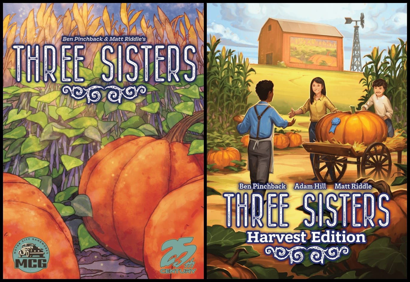 Three Sisters: Harvest Edition, which is co-designed by Adam Hill and due out in May 2026 from 25th Century Games, includes the original game as well as a new "twelve-chapter campaign mode", with the components and gameplay elements of this campaign being playable as expansions for the original game.