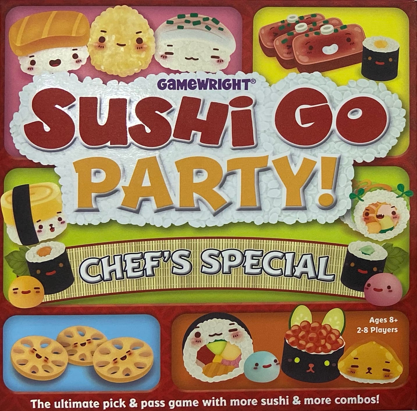 Sushi Go Party!: Chef's Special has more than 25 new sushi that are ready to be drafted by 2-8 players, and many of the new cards score based on how your holdings compare to those of your neighbors.