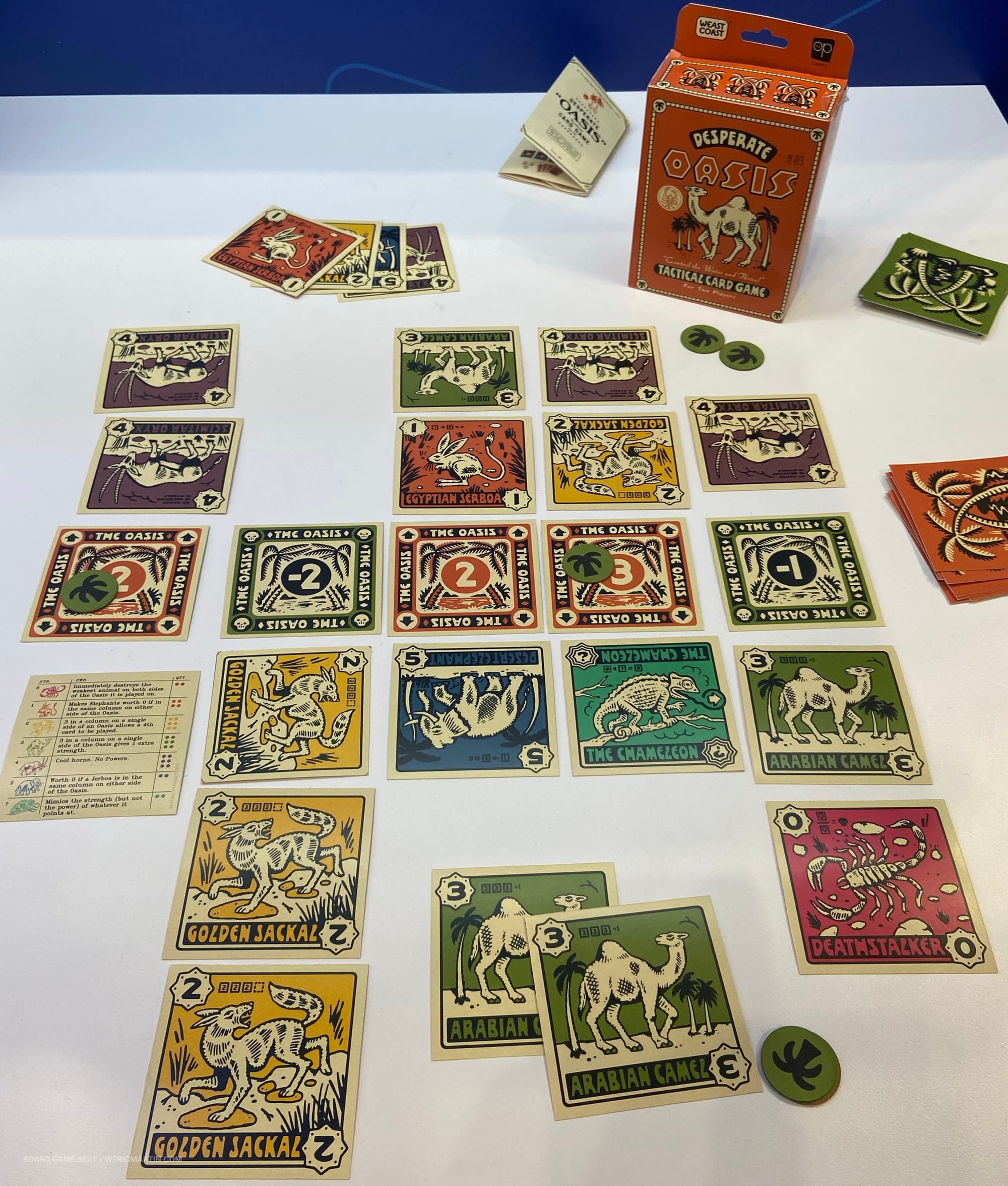 Yet another acquired game is Desperate Oasis, a lane-battling game from Dan Cassaro of Weast Coast in which two players take turns placing animal cards in rows, with some animals having immediate powers when played and others having ongoing effects. The Op's version of Desperate Oasis will be out in Q3 2026 and retail for US$15.